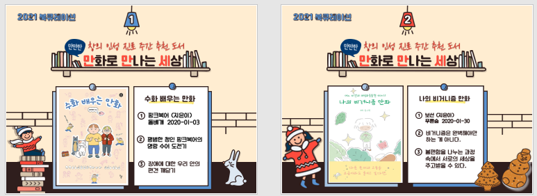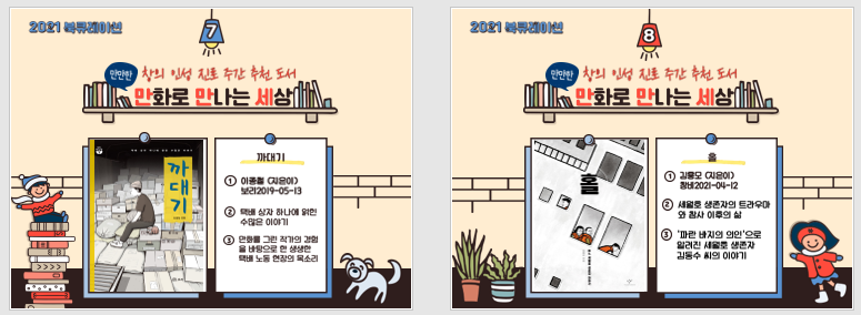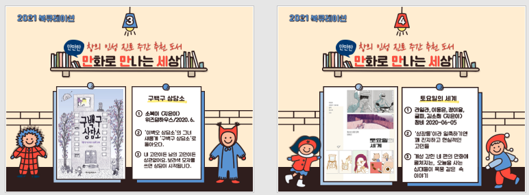 북인천중학교 교사 북큐레이션 0 2758 2021.12.01 17:31 2021 학교도서관 북큐레이션 결과보고 및 정산서.pdf (589.3K) + 61 북인천중 북큐레이션의 주제는 학기말 창의. 인성. 진로 주간 운영을 위한 "만만한 만화로 만나는 세상"입니다. 추천도서목록입니다.
