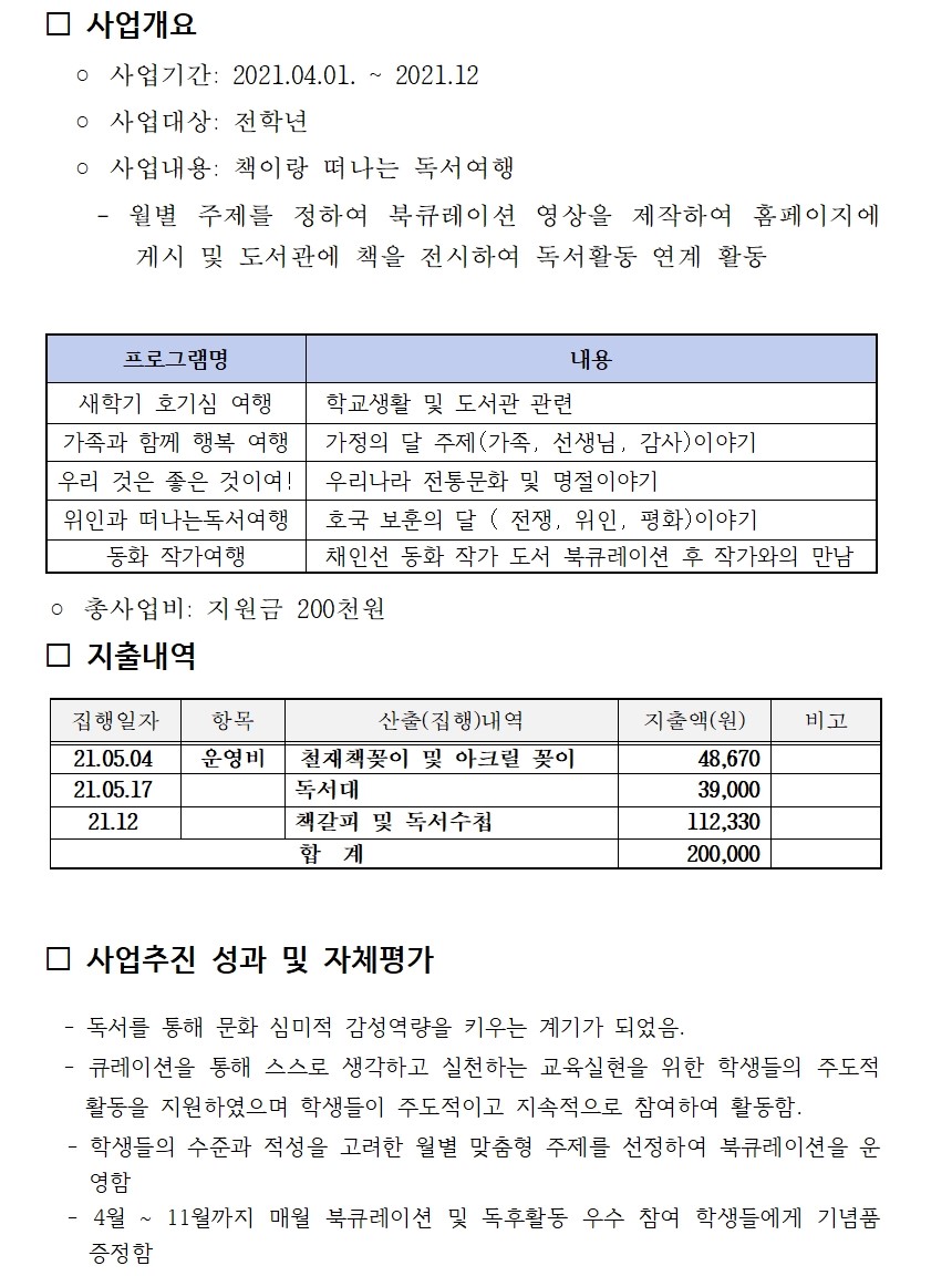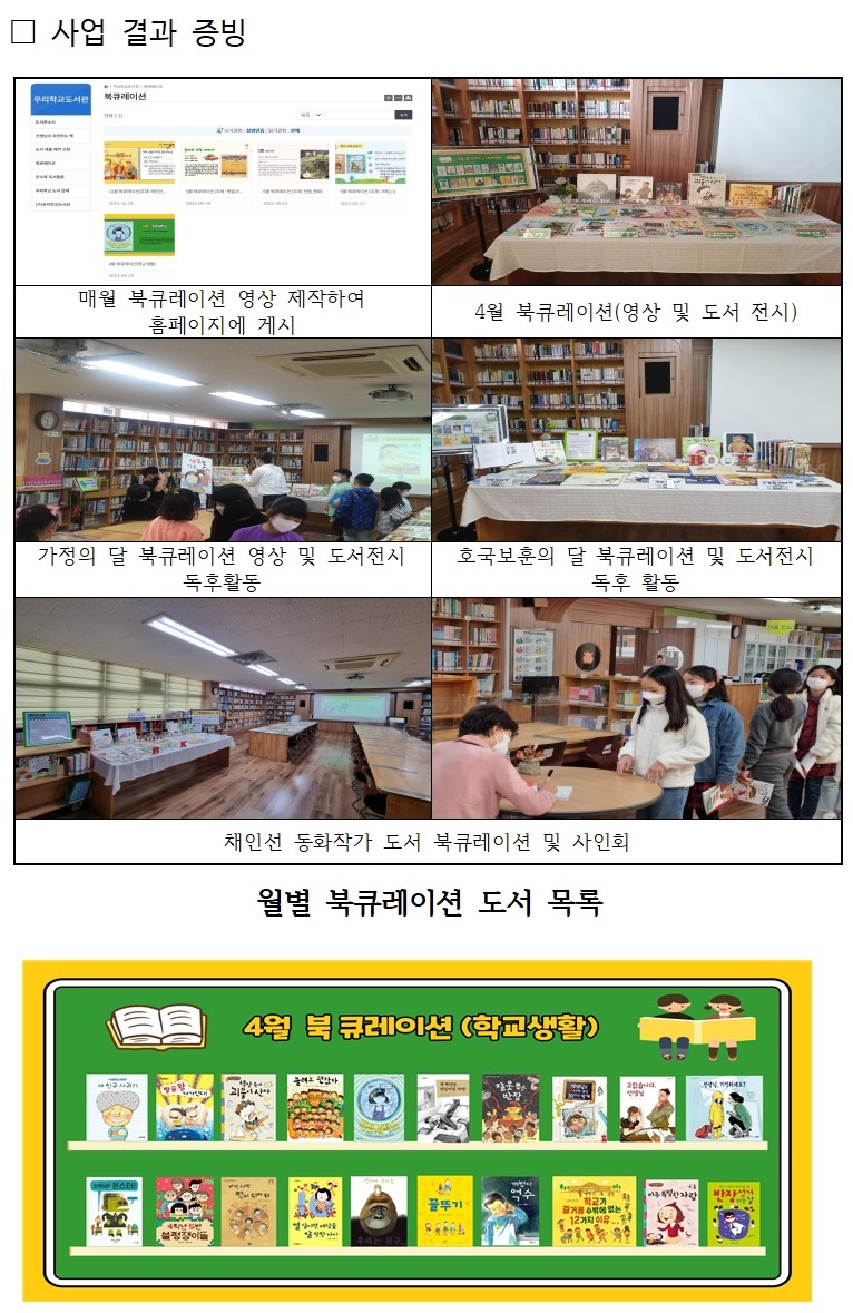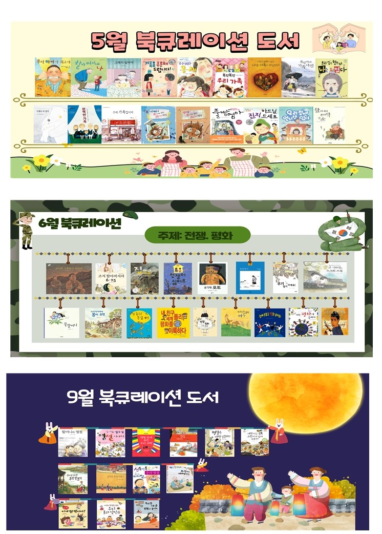 만수북초등학교에서는 월별 주제를 정하여 독서여행을 하였습니다. 주제별 북큐레이션 영상을 제작하여 홈페이지에 게시하고 도서관에도 북큐레이션 코너를 만들어 전시하고