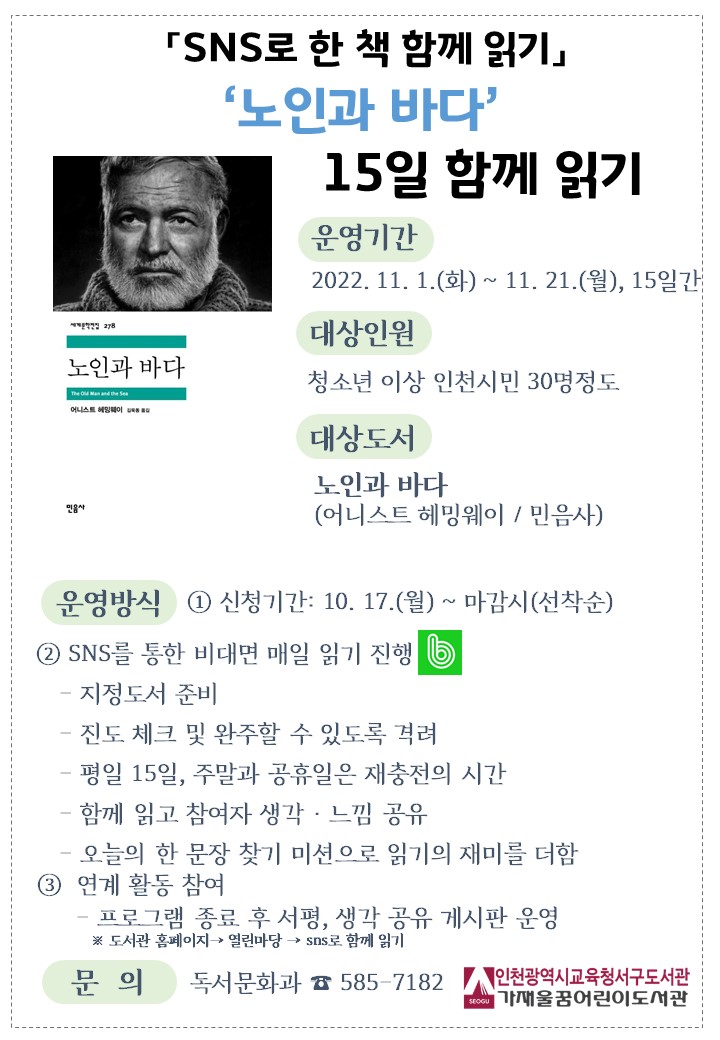 서구도서관 11월 SNS 함께읽기 모집안내 서구도서관에서는 11월 <SNS 함께읽기>로 '노인과 바다' 함께 프로그램 접수중입니다.많은 관심 부탁드립니다접수 바로가기↓↓↓↓↓↓↓↓↓↓↓↓↓인천광역시교육청서구도서관 > 평생·마을교육 > 온라인 수강신청 (ice.go.kr)