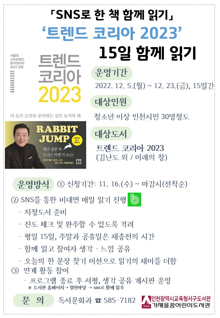 서구도서관 <트렌드 코리아 2023 함께읽기> 프로그램 접수 안내 서구도서관에서는 <트렌드 코리아 2023 함께읽기> 프로그램 접수중입니다.많은 관심과 참여 부탁드립니다.접수바로가기↓↓↓↓↓↓↓↓인천광역시교육청서구도서관 > 평생·마을교육 > 온라인 수강신청 (ice.go.kr)