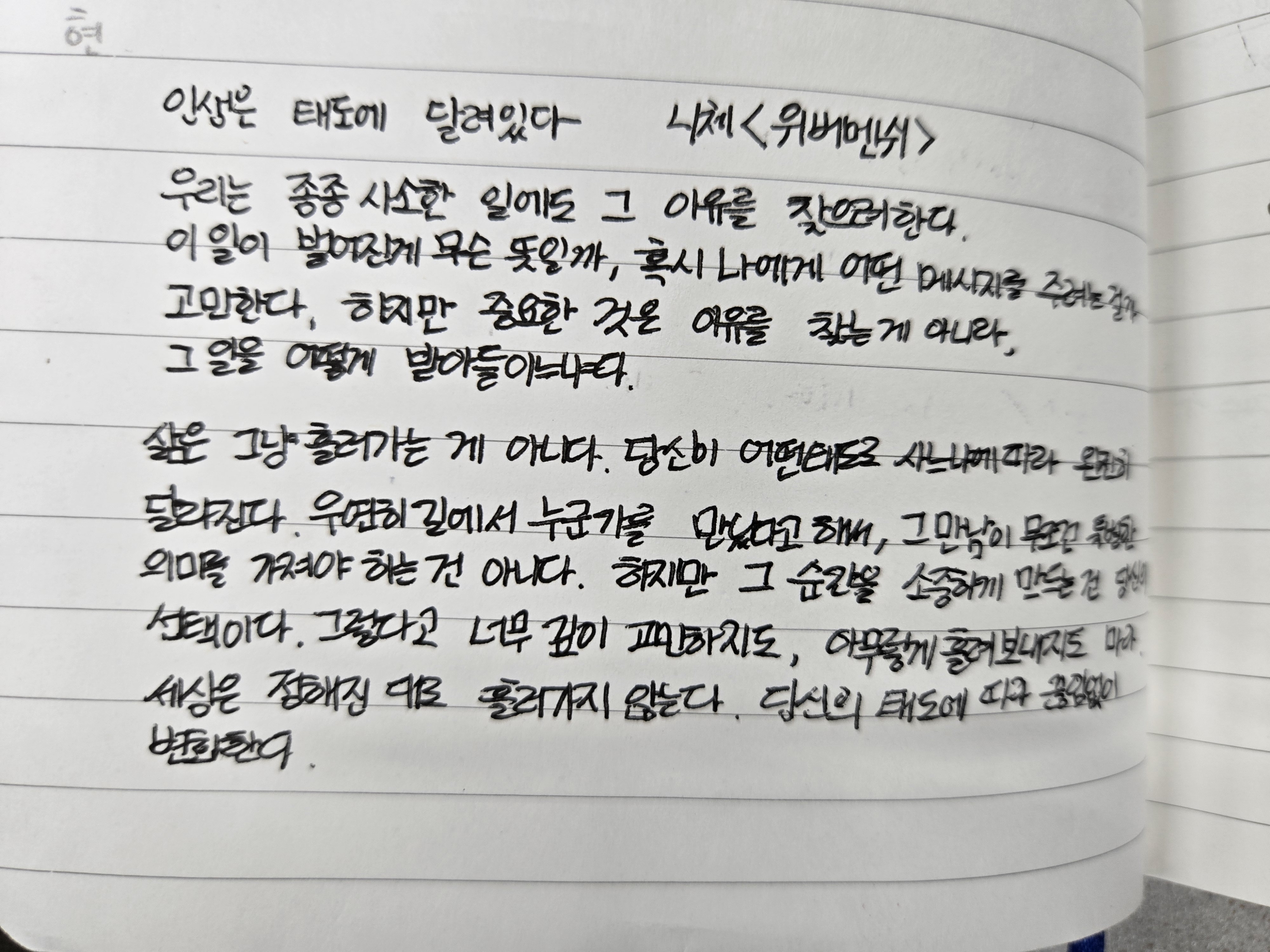삶은 그냥 흘러가는게 아니다. 당신이 어떤 태도로 사느냐에 따라 완전히 달라진다. 우연히 길에서 누군가를 만났다고 해서 그 만남이 무조건 특별한 의미를 가져야 하는건 아니다. 하지만 그 순간을 소중하게 만드는건 당신의 선택이다. 그렇다고 너무 깊이 고민하지도, 아무렇게 흘려보내지도 마라. 세상은 정해진대로 흘러가지 않는다. 당신의 태도에 따라 끊임없이 변화한다.