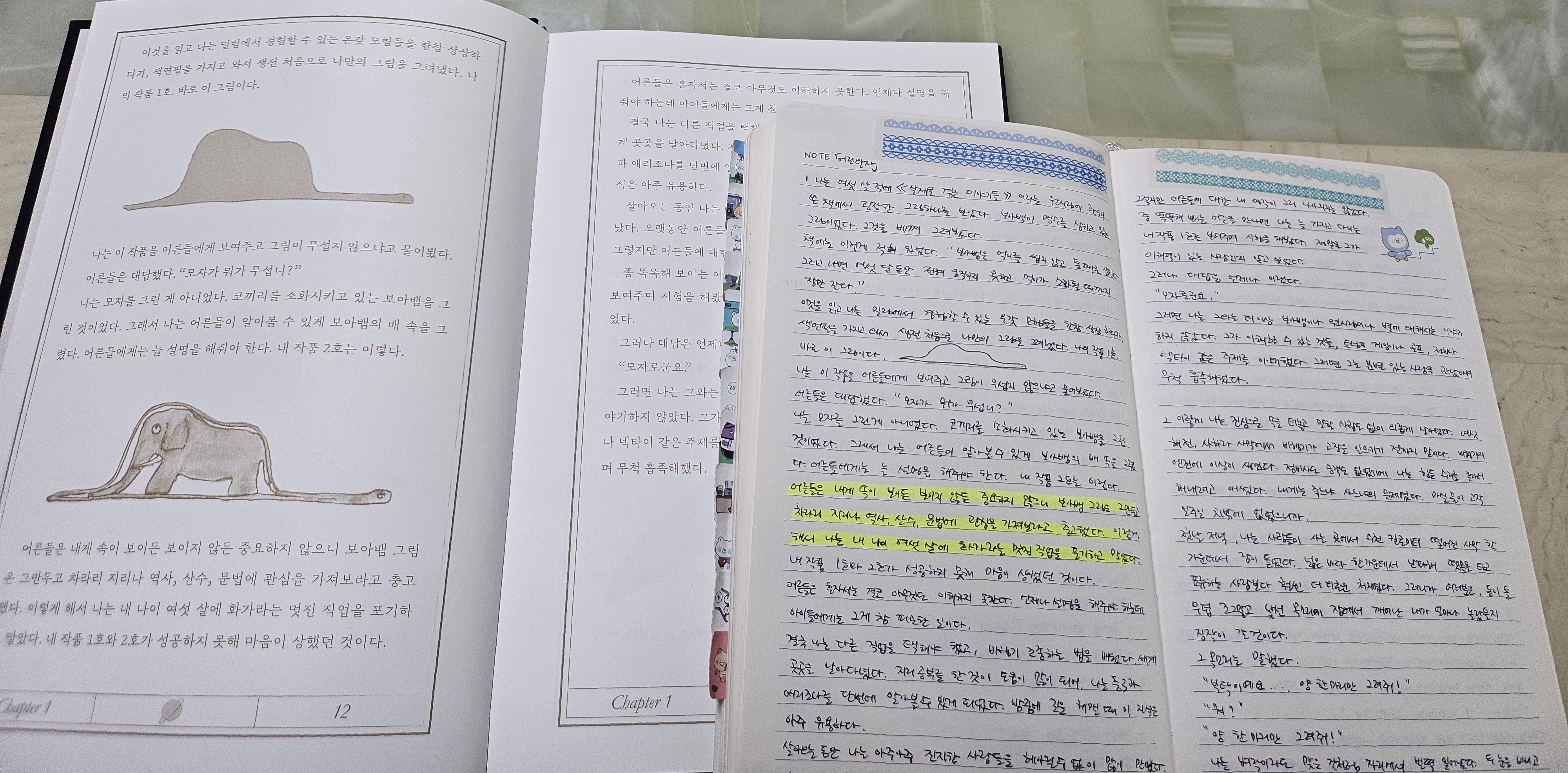 어른들은 나에게 속히 보이는 보아뱀이나 안 보이는 보아뱀의 그림 따위는 집어치우고, 차라리 지리나 역사, 산수, 문법에 재미를 붙여 보라고 충고했다. 나는 이렇게 해서 내 나이 여섯 살 때 화가라는 멋있는 직업을 포기했다.