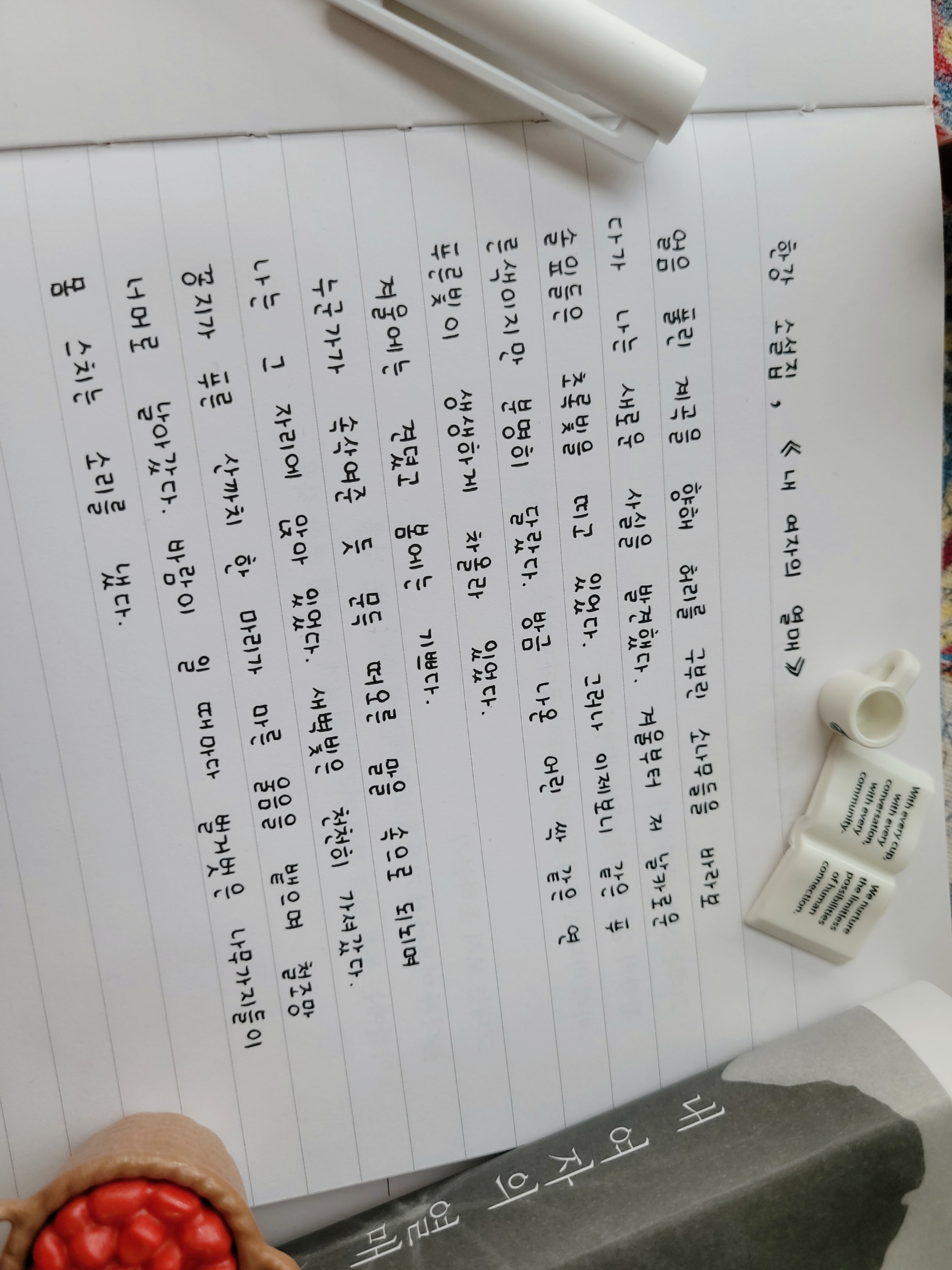 평소에도 필사하는 걸 좋아합니다. 책을 읽고나면 책의 내용을 전부 기억할 수는 없지만 감동적인 문장, 좋은 문장은 마음에 남아 있어 잃기 아쉬워 종이 위로 옮깁니다. 좋은 글을 지으려면 많이 읽고, 많이 쓰고, 많이 생각해야 한다고 합니다. '읽거쓰 필사 챌린지'를 통해 책을 가까이하고, 좋은 글을 쓰고, 생각하는 일들이 자연스레 이루어지면 좋겠습니다.
