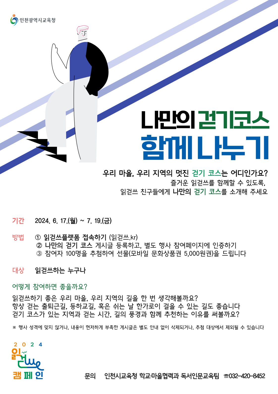 - 행사 내용: 내 인생 반려책, 나만의 걷기 코스를 소개해주세요. 행사에 참여하신 분 중 총 200명을 추첨하여 기념품(모바일 문화상품권 5천원권)을 증정합니다.