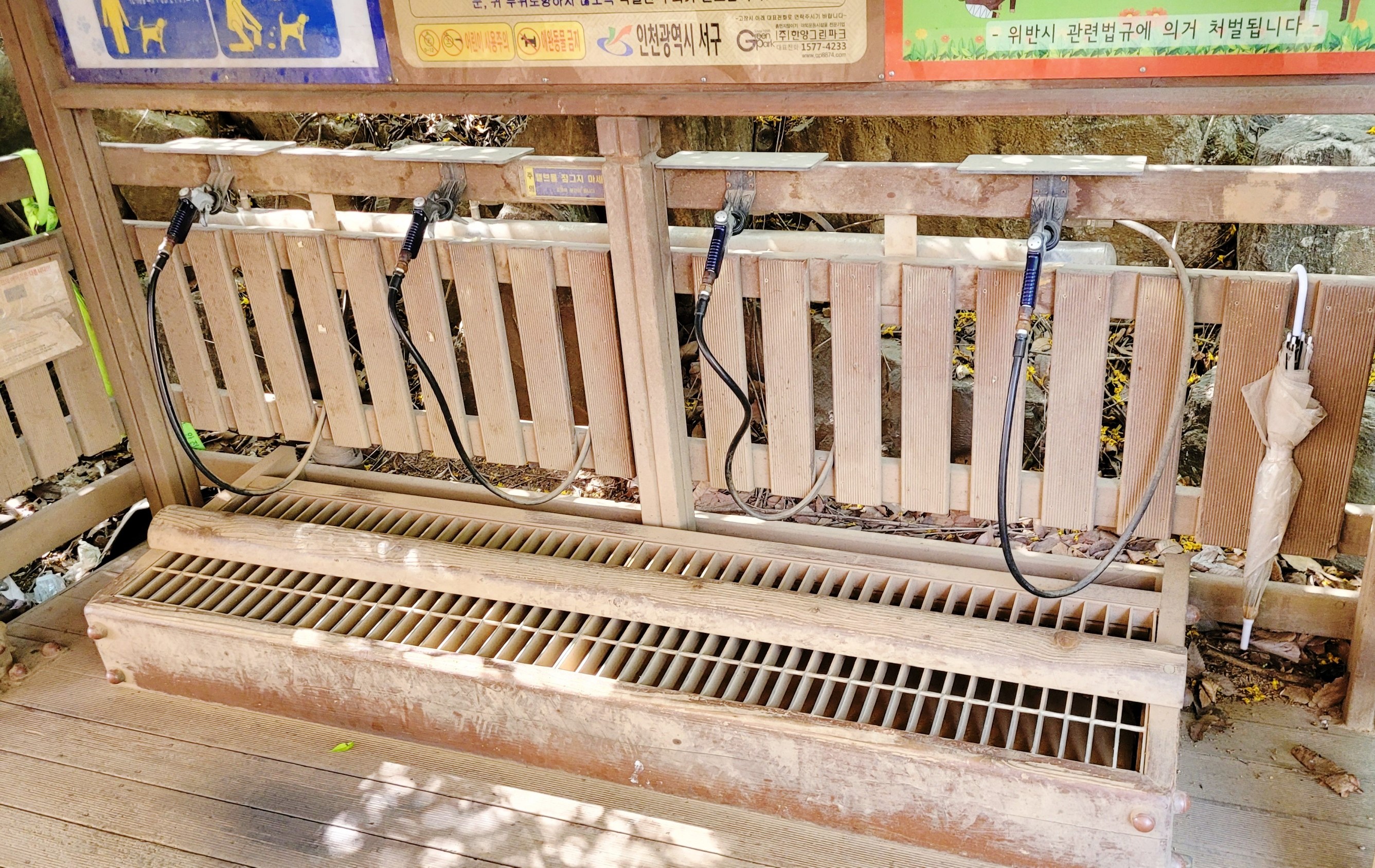 등산로 출구에는 이렇게 에어건이 있어서 등산하는 동안 신발과 옷에 묻었던 흙을 털어낼 수 있습니다.