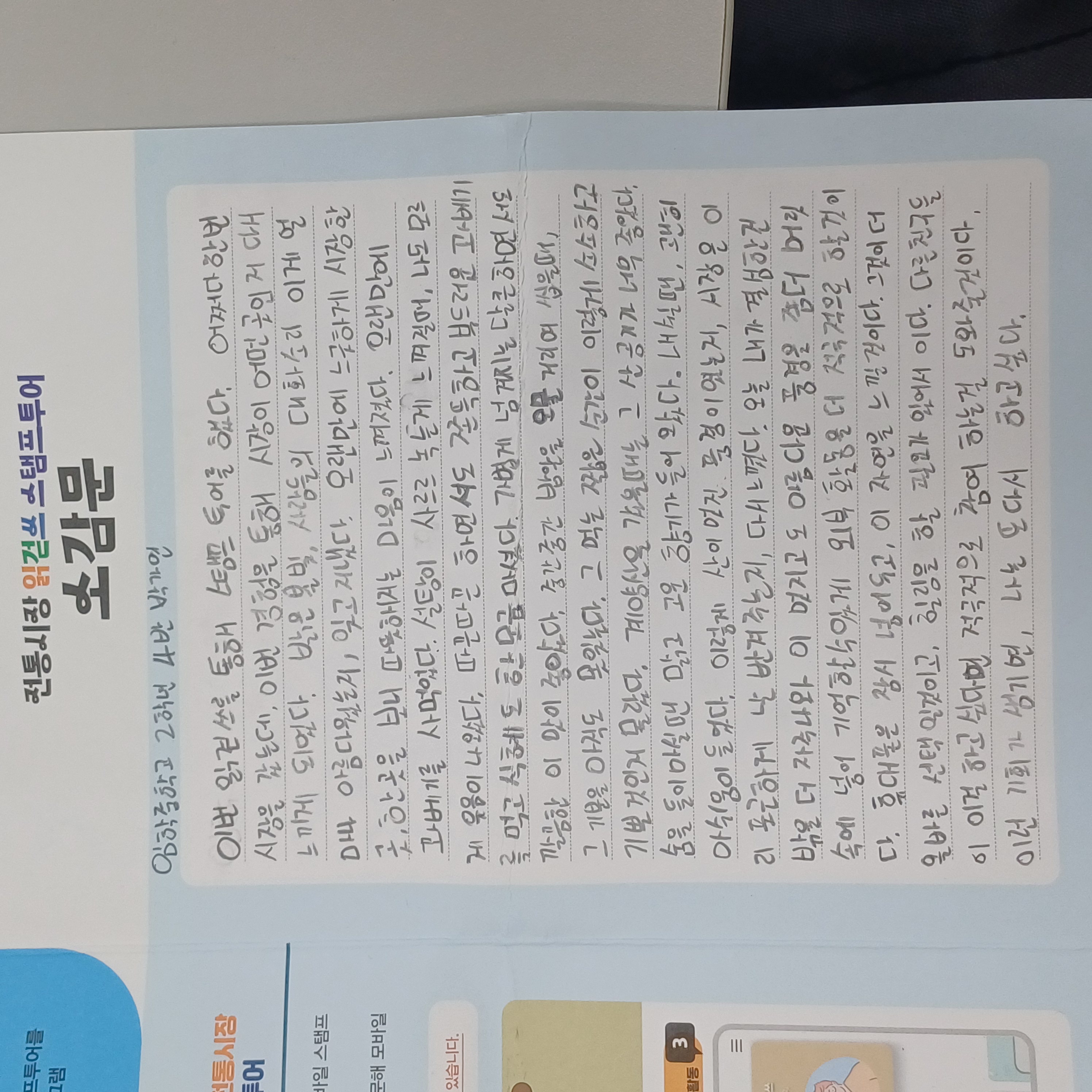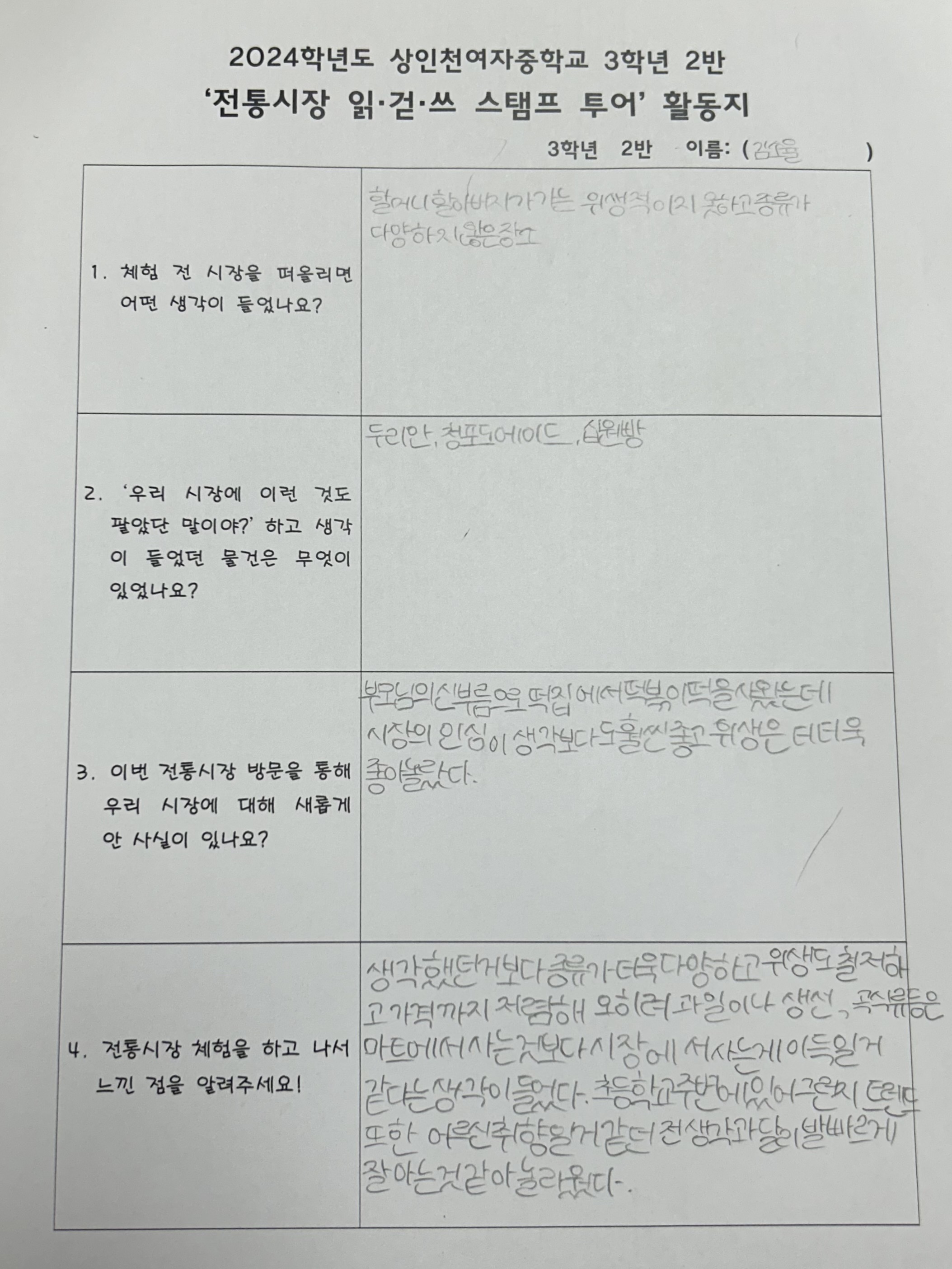 학교에 가서 궁금한 걸을 질문하고 설명받는 시간이 진로와 연계되어 있어서 더욱 흥미로웠고 재미있었다. 전통시장의 다정다감하고 북적허고 친근한 분위기를 느낄 수 있어서 좋았고 맛있는걸 먹을 수 있어서 즐거웠다. 계산 시장의 매력을 느낄 수 있었다. 학교 동아리 수업을 통해 이런 재밌는 활동을 해사서 매우 인상깊은 하루가 되었다. 앞으로도 자주는 아니겠지만 어쩌다 한 번씩 들리면 좋겠다는 생각 또한 들었고 가족과도 그 이후에 한 번 들려 추억을 쌓는 계기가 되었다.