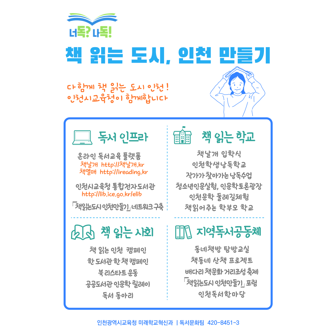 마지막으로 가정, 학교, 지역사회와 책 읽는 인천 캠페인을 전개하며 교육청 소속 공공도서관을 중심으로 한 도서관 한 책 캠페인’, ‘북 리스타트 운동’, ‘인문학 릴레이 등 시민 참여형 독서사업이 온·오프라인으로 일 년 내내 진행된다.