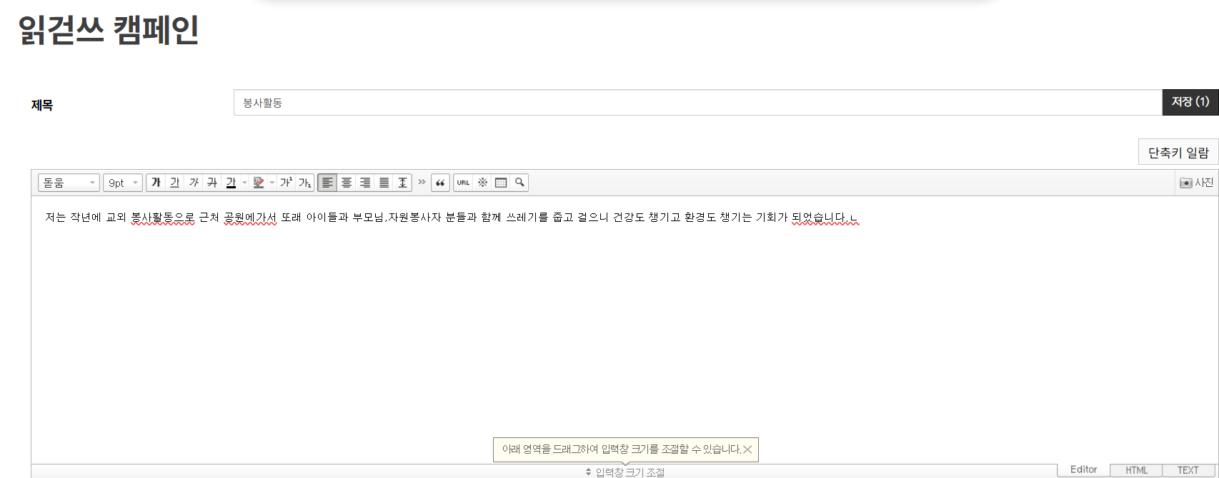 저는 작년에 교외 봉사활동으로 근처 공원에가서 또래 아이들과 부모님,자원봉사자 분들과 함께 쓰레기를 줍고 걸으니 건강도 챙기고 환경도 챙기는 기회가 되었습니다.ㄴ