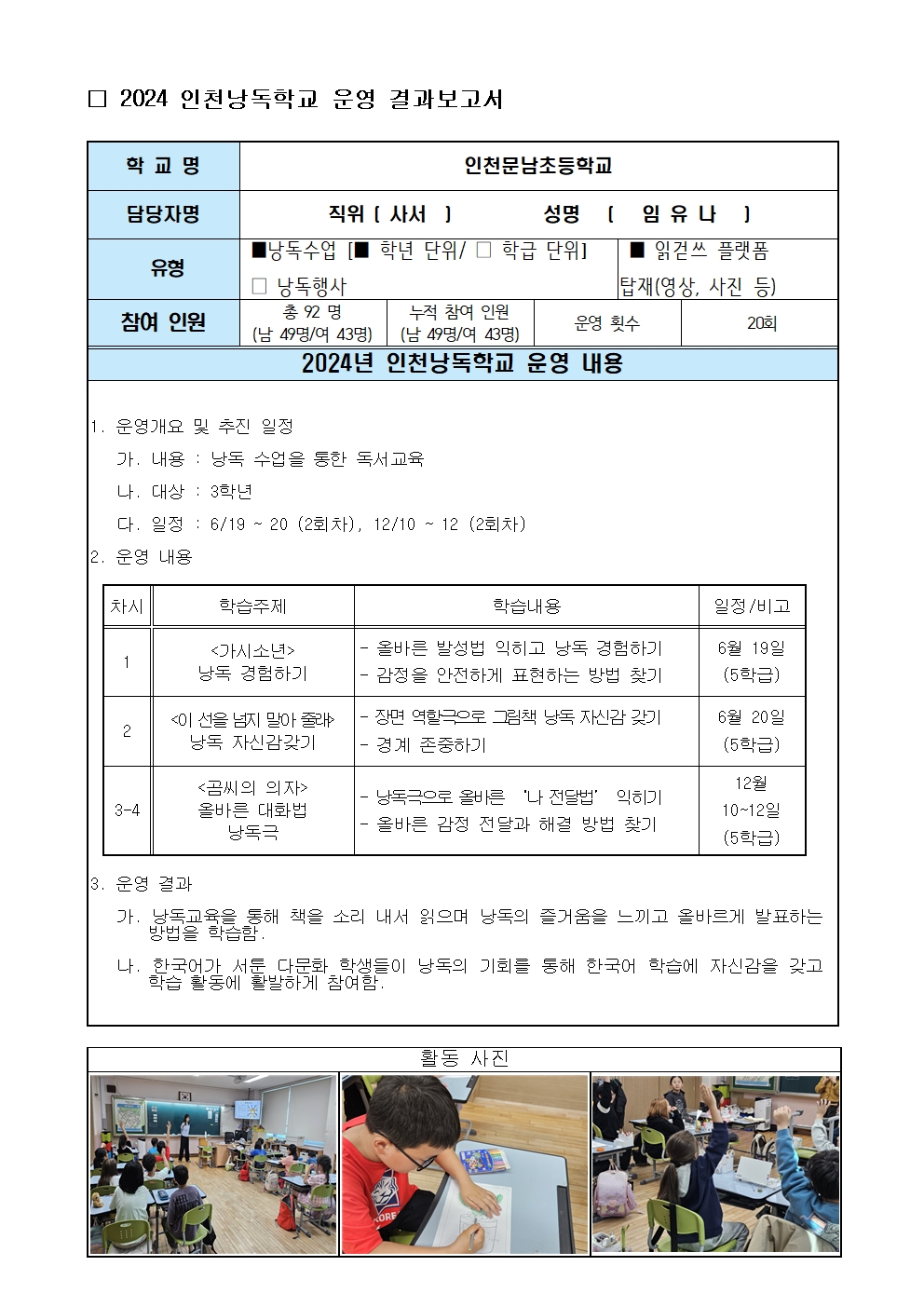 [인천문남초등학교] 2024 인천낭독학교 운영 결과 보고