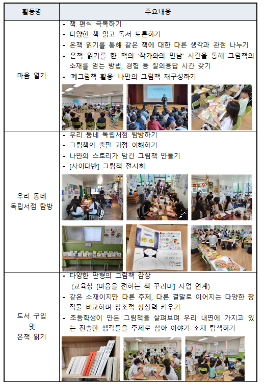 - 단순히 지식과 정보를 배우는 딱딱한 책읽기에서 벗어나 사고력과 창조적 상상력을 키우기 위해 능동적으로 책을 읽고, 더 나아가 자신의 생각을 이야기책으로 만들어 창작해보도록 함으로써 읽기와 쓰기(창작표현)을 함께 해나갈 수 있는 경험을 제공하고자 함