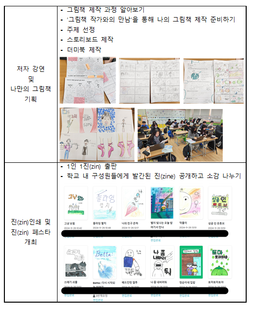- 1학기 중 독립서점 탐방으로 다양한 그림책의 형태와 독립 출판에 대해 이해하고, 미니그림책 1권씩을 제작해 본 학생들을 대상으로 ‘나만의 책(zin)을 만든다면?’을 주제로 프로젝트 수업 진행