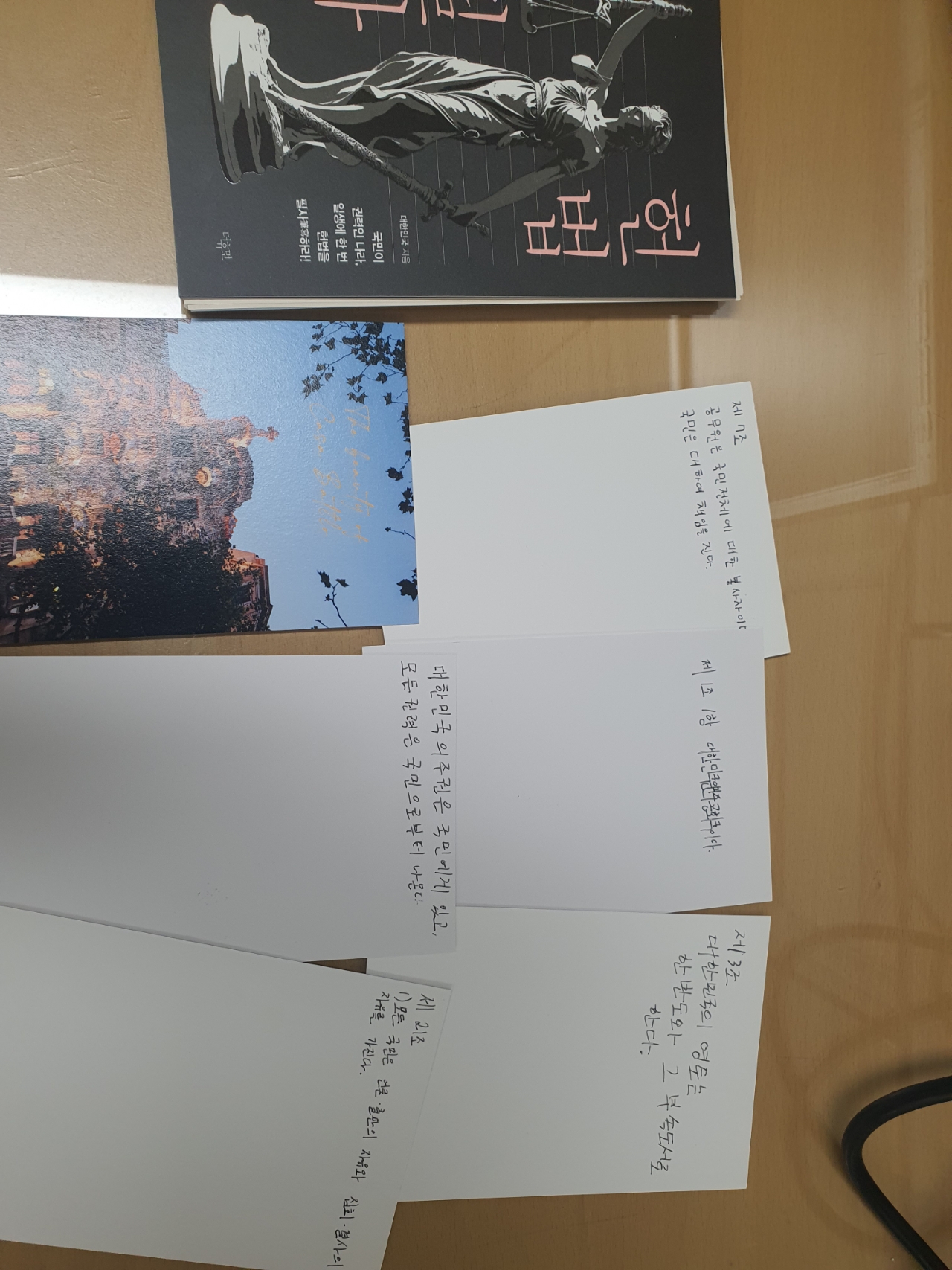 -활동 내용 : 역사와 사회의 다양한 주제에 대해 탐구하는 자율동아리의 동아리원 들이 방과후에 모여서 헌법 필사 활동을 하고, 헌법 내용 중에서 관심 있는 법 조항을 엽서에 써보는 활동을 하였다.