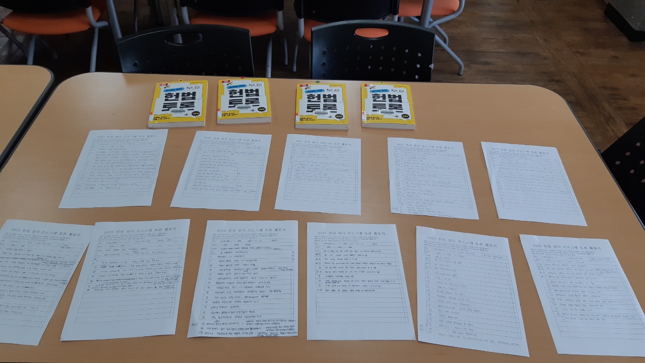 -활동 내용: 도서 '10대를 위한 헌법 토론'을 읽고, 토론팀(3~4인)을 나눈 뒤, 논제 2개를 선택하여 개인별 토론 활동지를 작성했고, 팀별 토론을 진행함.