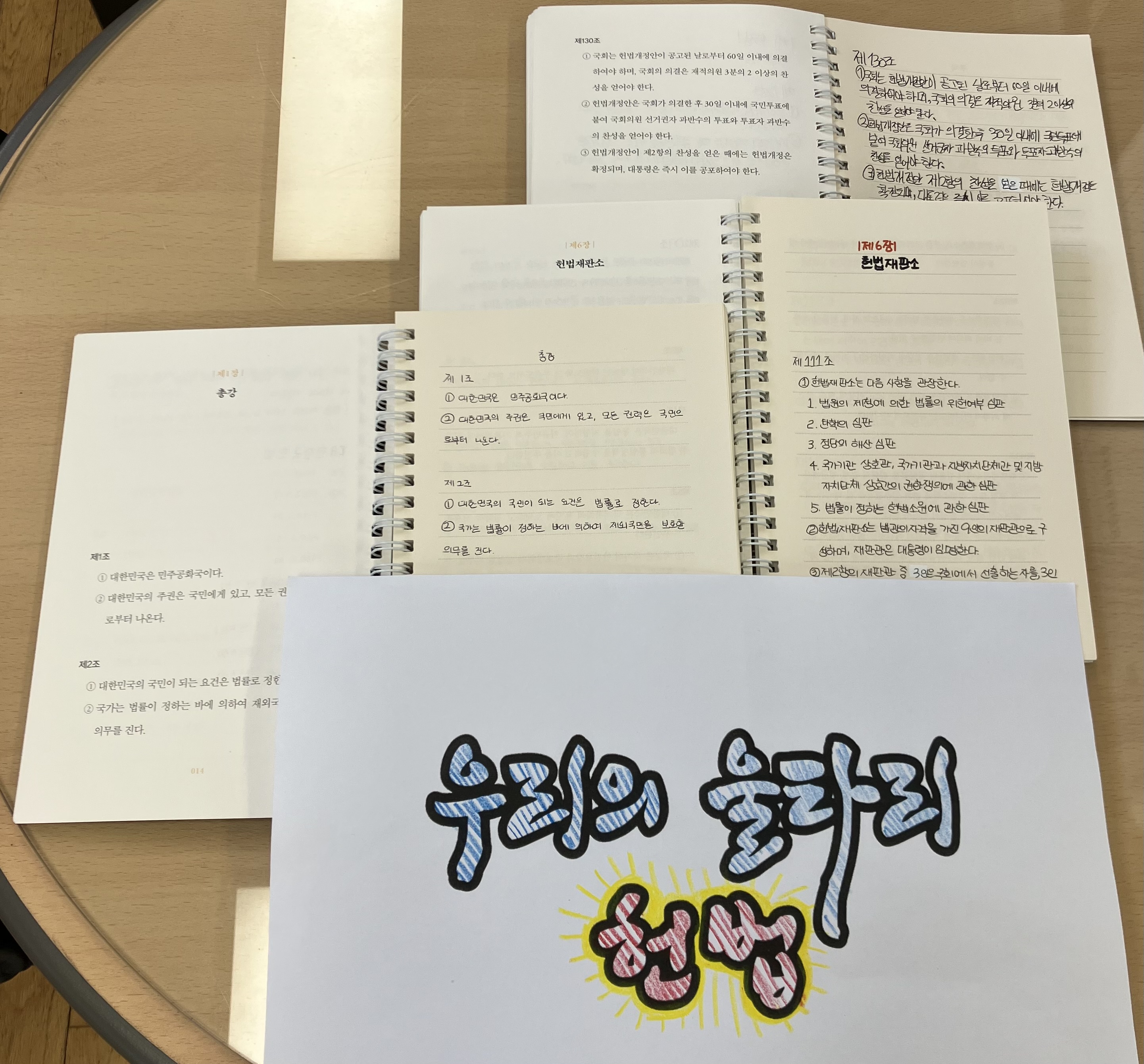 헌법 필사 활동 참여 희망자를 모집하여 개인적으로 필사 활동을 진행하였고 중간 점검을 거쳐 최종 완료되었고, 헌법 관련 캘리그리피 활동을 추가하여 헌법의 중요성을 이해함.