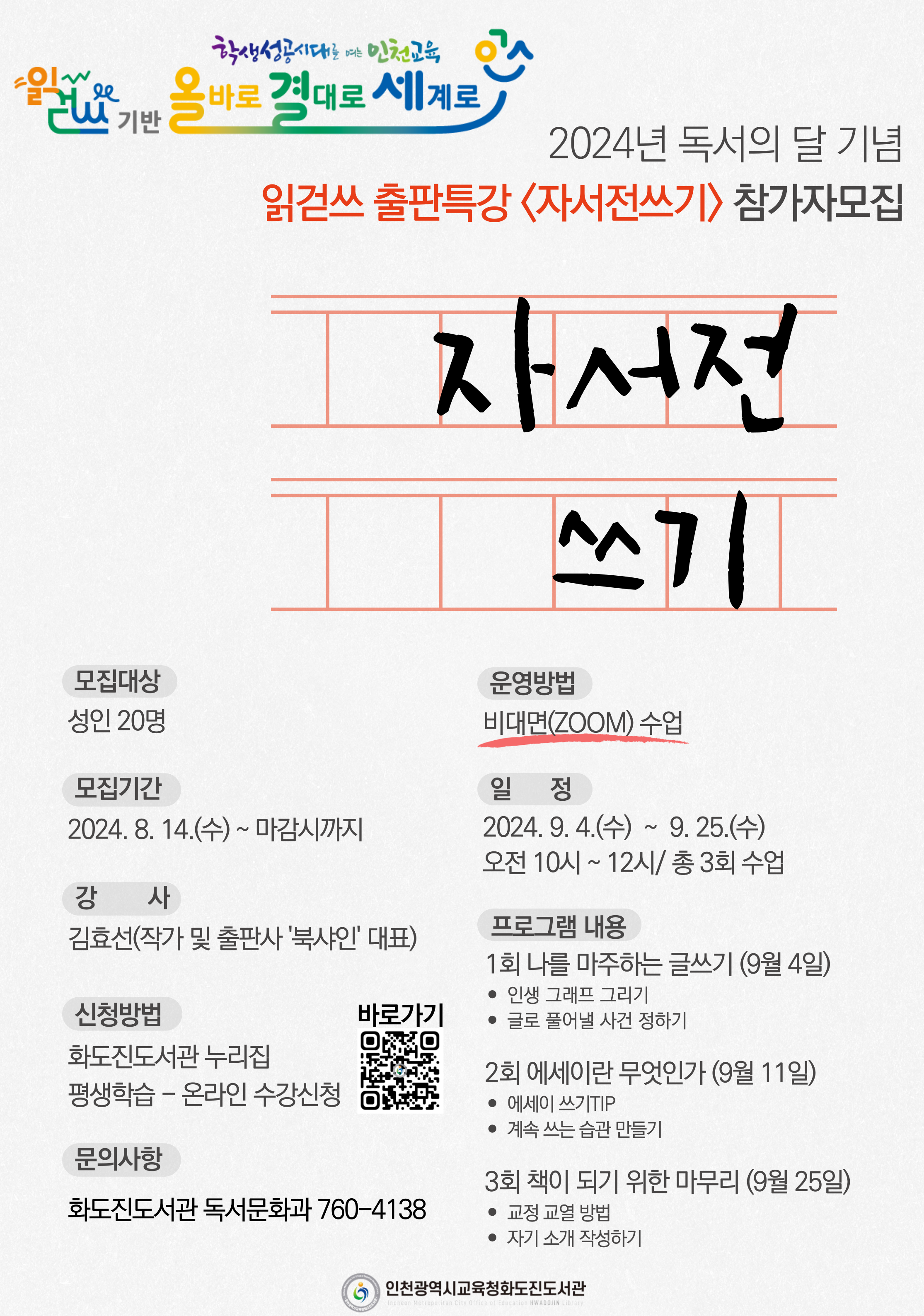 2024년 독서의 달을 기념하여 읽걷쓰 출판특강 「자서전쓰기」강의를 운영하니 많은 관심 부탁드립니다.