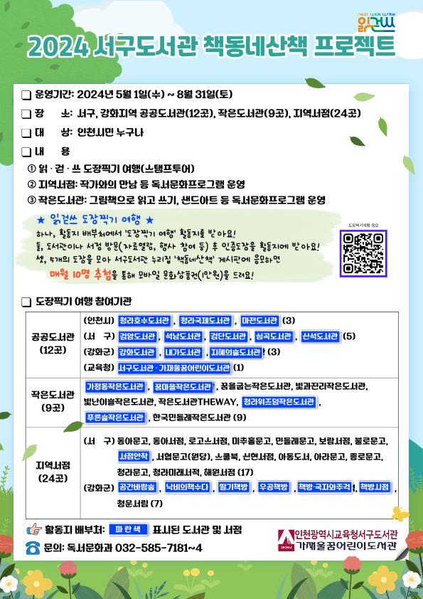 책과 함께 산책하듯 여행하듯 5월부터 8월까지 네 달간 서구, 강화지역의 공공·작은도서관, 동네서점을 거닐며 읽고, 쓰고, 사유할 수 있는 행복한 스탬프투어를 의미합니다.