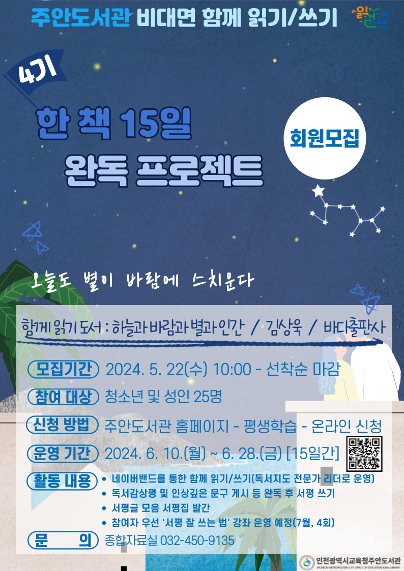 주안도서관에서는 도서 하늘과 바람과 별과 인간을 중심으로 한 책 15일 완독 프로젝트 4기를 운영합니다.