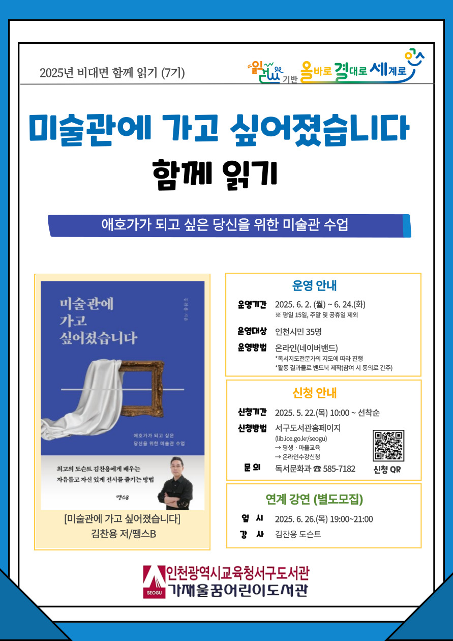 서구도서관 비대면 함께읽기 7기 "미술관에 가고 싶어졌습니다" 참가자 접수 안내입니다.