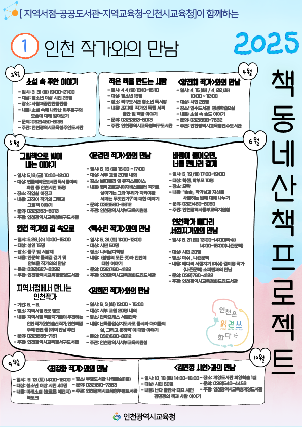 인천광역시교육청에는 지역서점-공공도서관-작은도서관 등 독서공동체 간 연계, 협력체제 구축을 통한 지역사회 읽걷쓰 활성화를 위하여 각 기관의 「2025년 책동네산책 프로젝트」를