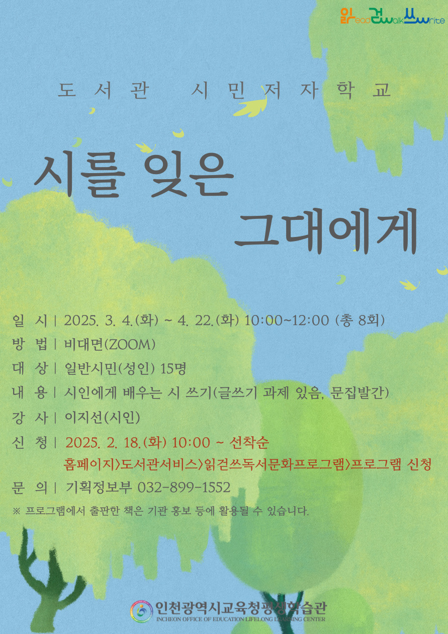 평생학습관 2025년 도서관 시민저자학교 '시를 잊은 그대에게' 참여자 모집