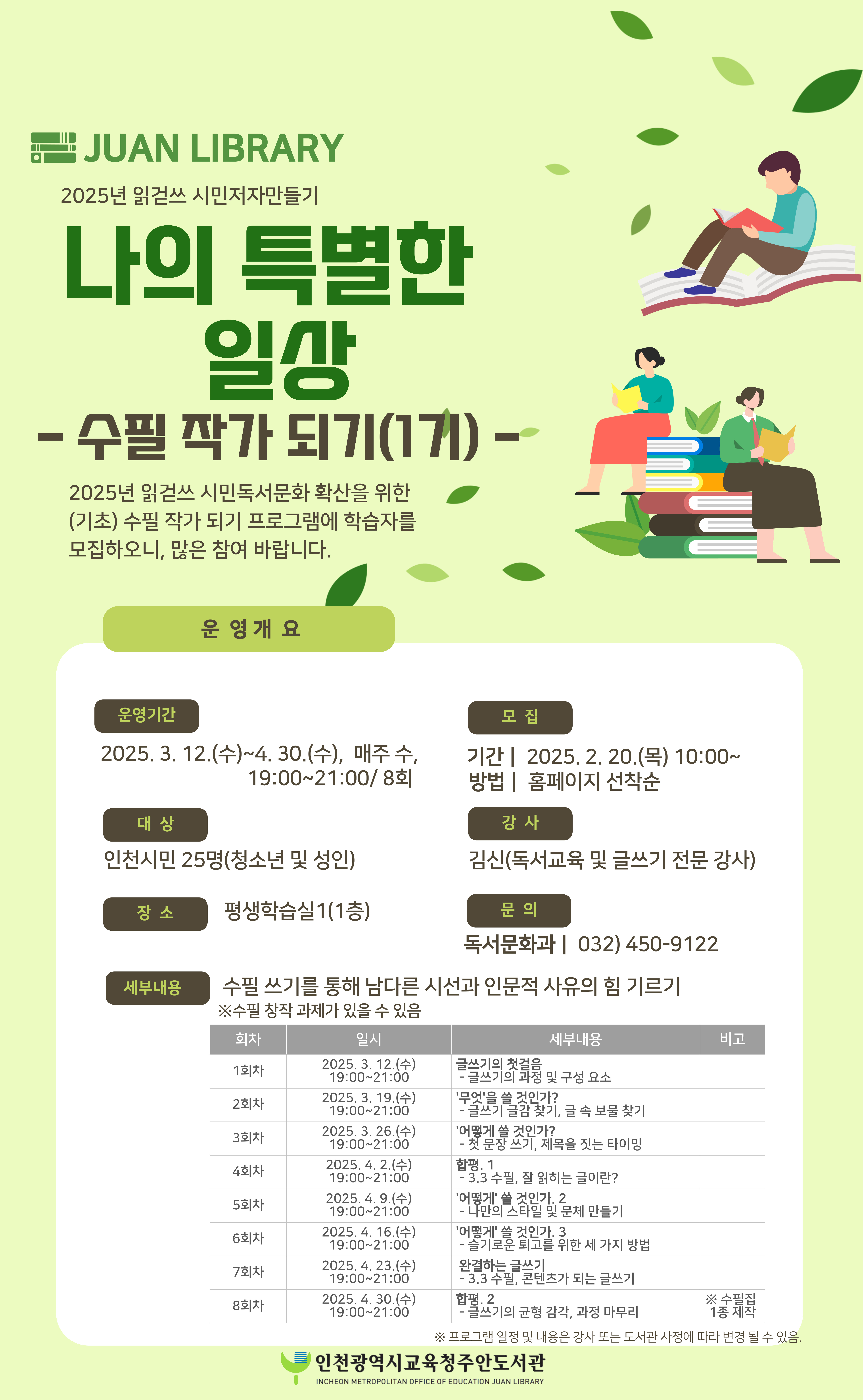 ※ 모집: 2025. 2. 20.(목) 10시부터 홈페이지 선착순 접수(https://lib.ice.go.kr/juan/module/teach/index.do?menu_idx=85)