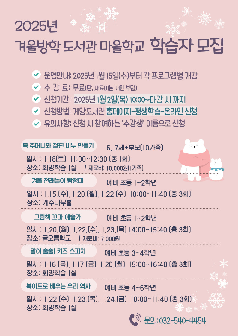 인천광역시교육청계양도서관에서는 방학을 맞이하여 유아 및 초등학생들에게  도서관 특색을 반영한 학습 기회를 제공하기 위해 [겨울방학 도서관 마을학교]를 운영합니다.